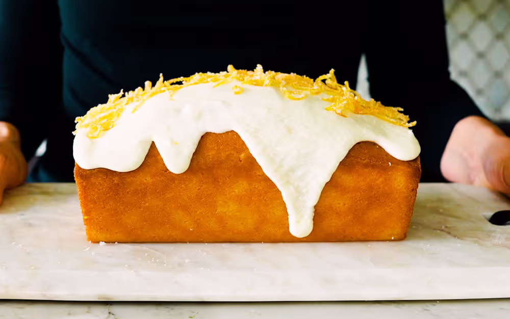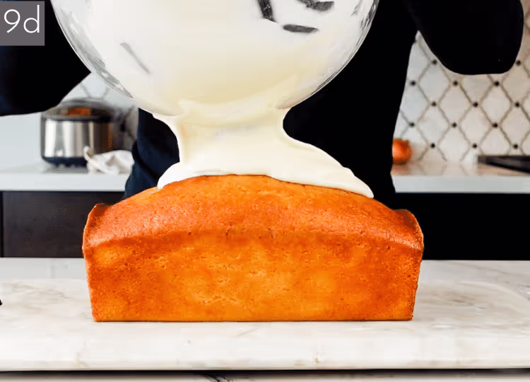 Pour the glaze atop the loaf and garnish with candied zest (9d).
