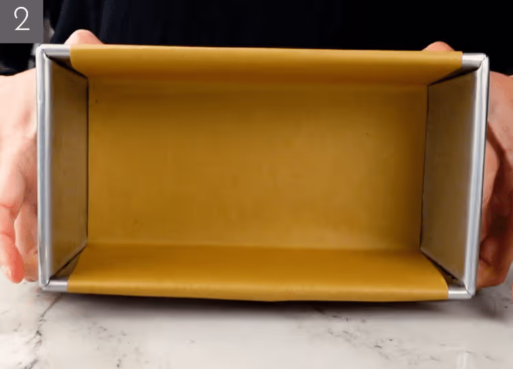 Prepare an 8-inch (also called a 1-lb) loaf pan by creating a parchment sling. Spray with baking spray.