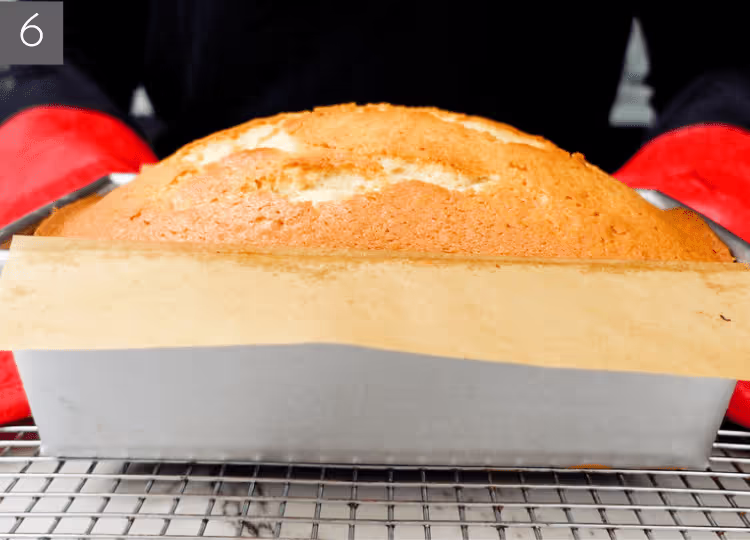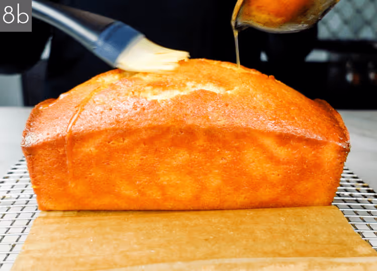 Set aside 2-3 tablespoons of this syrup in a small bowl for your frosting later. - Apply Syrup/Cool slightly: Once your loaf is done baking, remove it from the oven and carefully use the sling to remove it from the pan. Use a toothpick to poke some holes through the top. Brush some syrup atop the loaf.