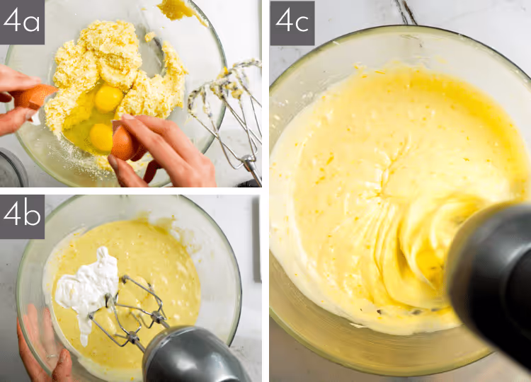 Add the eggs and mix (4a). Then add the sour cream and mix (4b). Add the water and mix (4c).