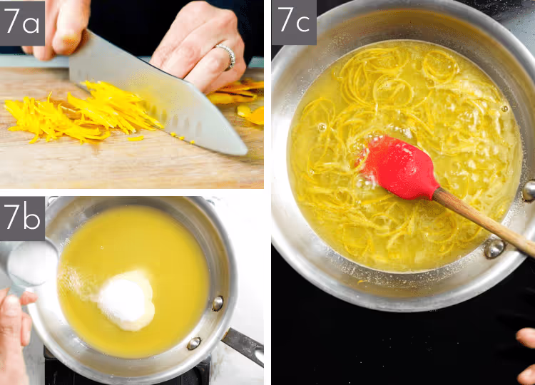 Remove and slice the zest for a candied zest topping to garnish the loaf, optionally (7a). Make a syrup by adding the juice of lemons and sugar to a small saucepan (7b). Bring syrup to a boil and simmer for a few minutes (7c).