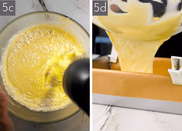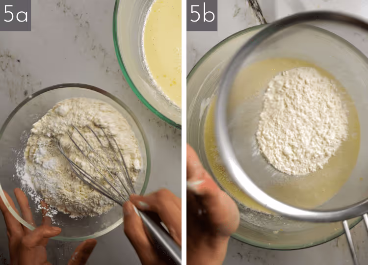 Whisk together the flour and baking powder in a small bowl (5a). Sift the flour mixture into the liquid batter in three additions, mixing after each addition until no visible flour remains (5b, c).